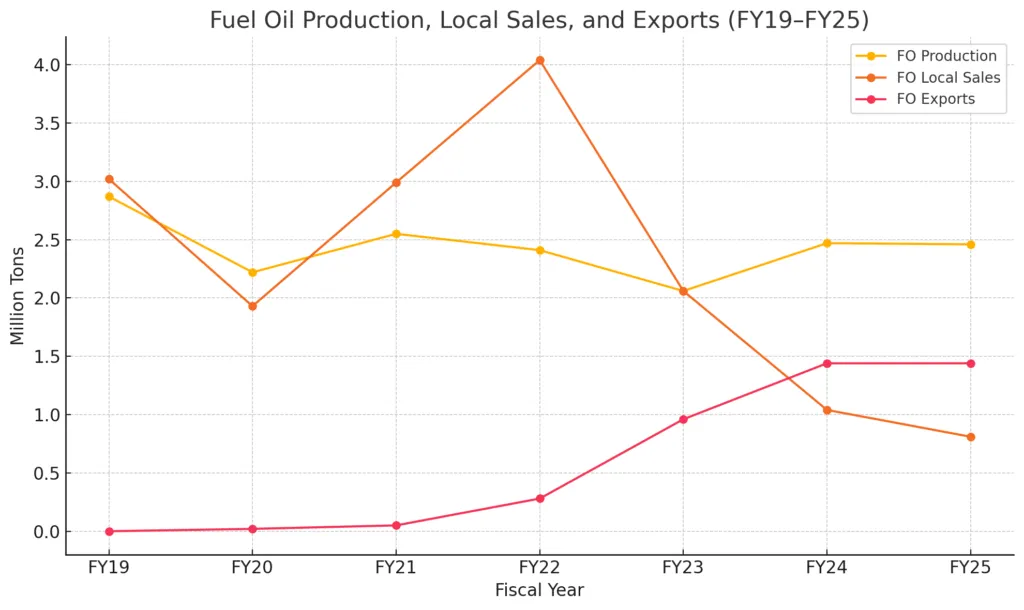 NEPRA and OCAC data show FO exports jumped from 0.02 million tons in FY20 to 1.44 million tons in FY25. Over the same period, domestic sales collapsed from 4.04 million tons in FY22 to just 0.81 million tons in FY25.